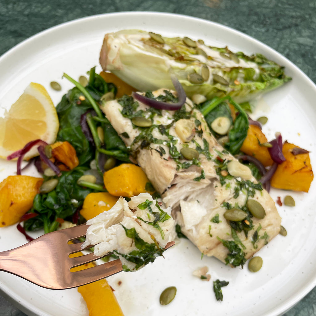 Tray Baked Stone Bass with a Herby Rub and Roasted Pumpkins, Red Onions, Garlic and Wilted Spinach